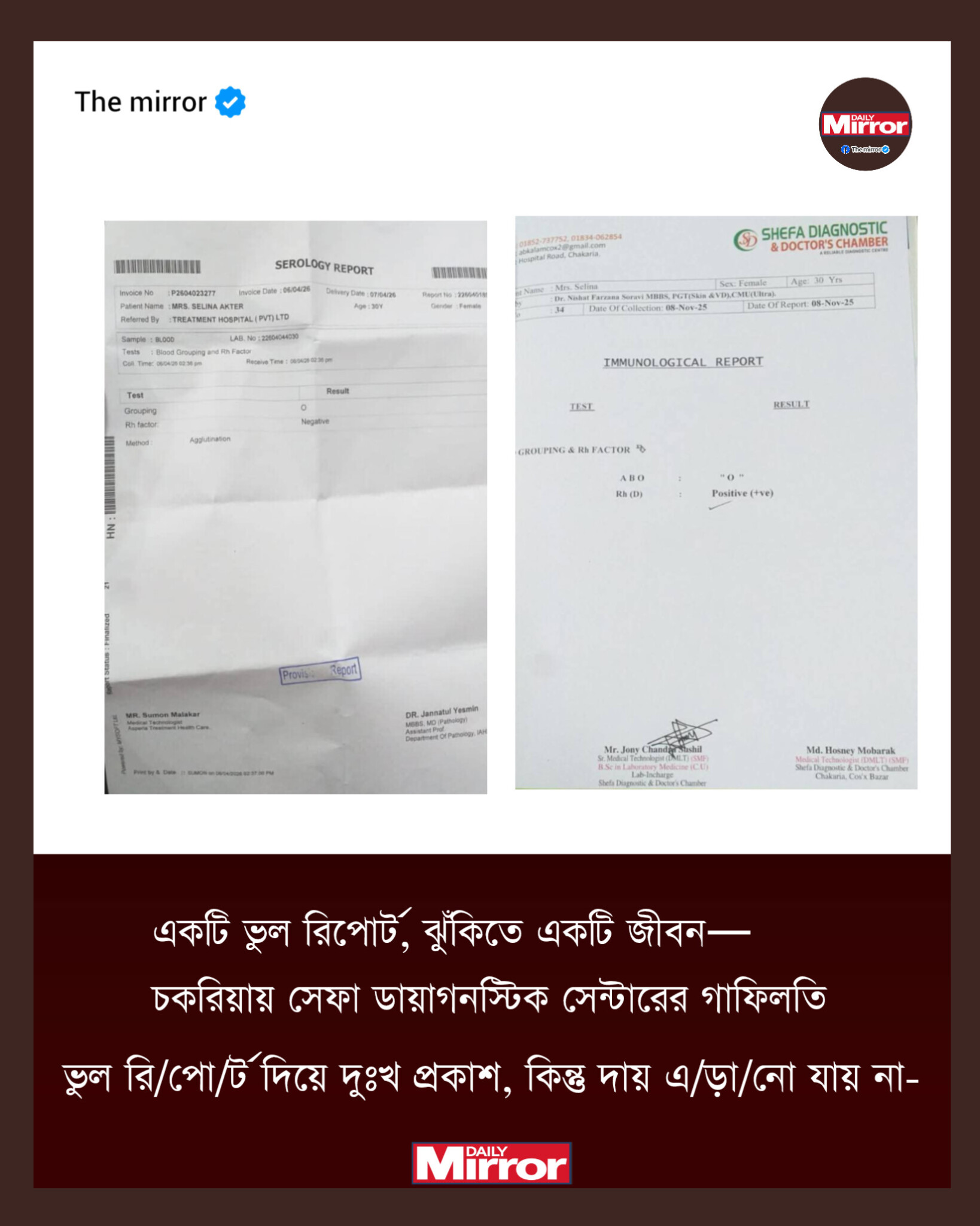 জানা যায়, চকরিয়া উপজেলার বরইতলী এলাকার এক গর্ভবতী নারী, যার জরায়ুর দুই পাশে দুটি টিউমার শনাক্ত হয়, তাকে জরুরি ভিত্তিতে চিকিৎসার জন্য একটি বেসরকারি ডায়াগনস্টিক সেন্টার—সেফা ডায়াগনস্টিক সেন্টারে নেওয়া হয়। সেখানে তার ব্লাড টেস্ট করা হলে রিপোর্টে তার রক্তের গ্রুপ “O Positive” উল্লেখ করা হয়।