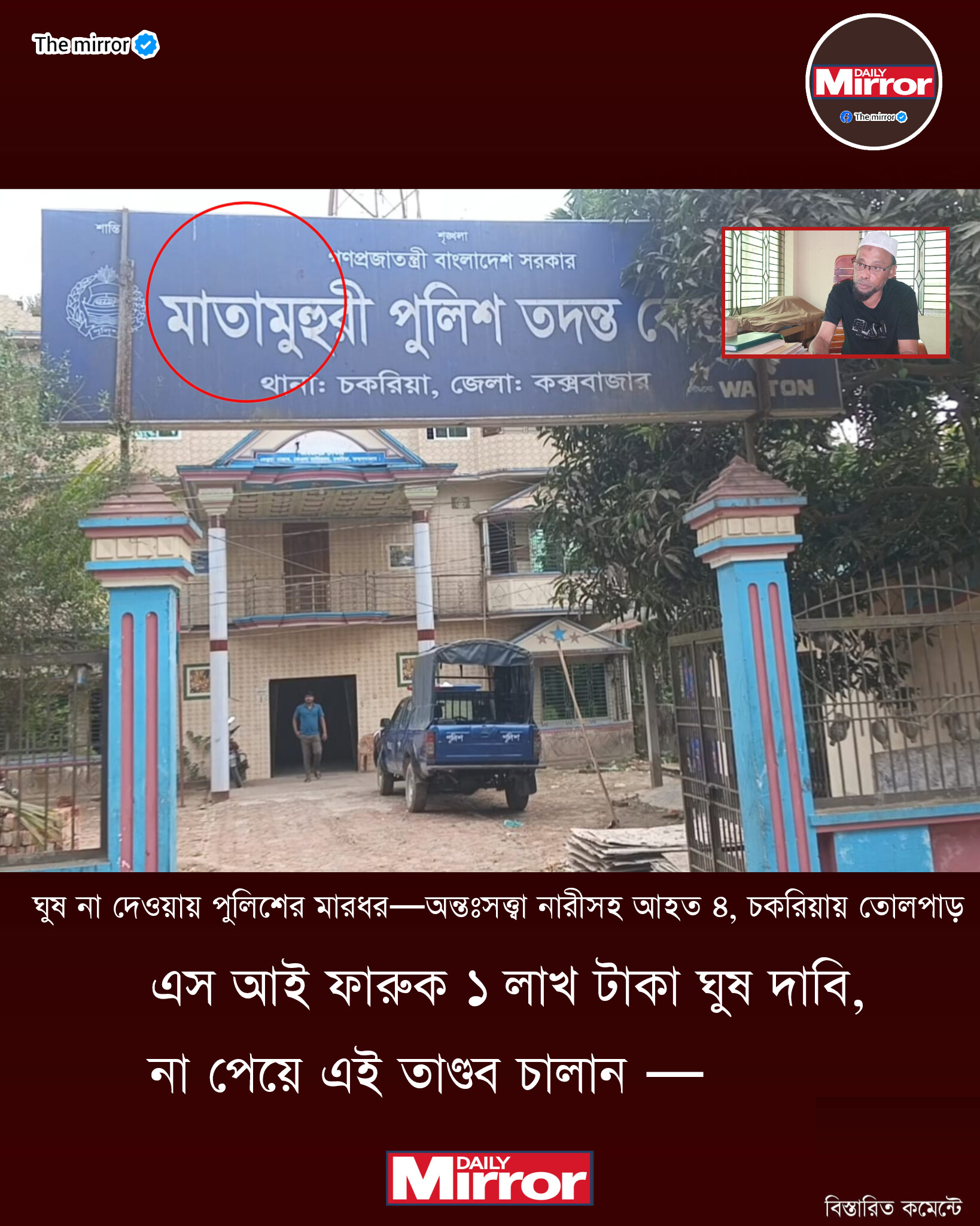 কক্সবাজারের চকরিয়ায় পুলিশের চাহিদা মতো ঘুস না দেওয়ায় বাদীকে তুলে নিয়ে মারধর করে জোরপূর্বক স্টাম্পে সাক্ষর আদায়, পুলিশের উপস্থিতিতে বিবাদী পক্ষকে ঘর নির্মাণে সহযোগিতা, জবরদখলে বাঁধা দেওয়ায় নারীদের উপর হামলার অভিযোগ উঠেছে মাতামুহুরি পুলিশ তদন্ত কেন্দ্রের উপ পরিদর্শক (এসআই) ফারুক হোসেনের বিরুদ্ধে। এসময় অন্তঃসত্ত্বা নারীসহ কমপক্ষে চারজন আহত হয়েছে।